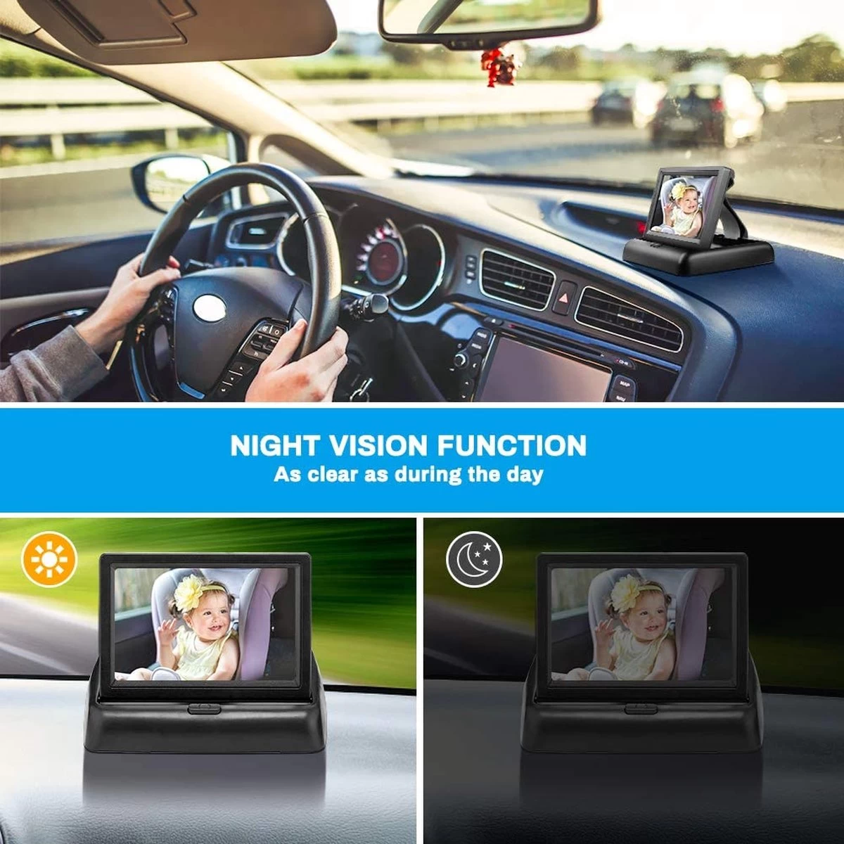 De HD-camera beschikt over een infrarood nachtzicht-functie. Zelfs als je ’s nachts rijdt, kun je de toestand van je kinderen goed zien. Het scherm is 9cm groot, zodat alles duidelijk weergegeven wordt.