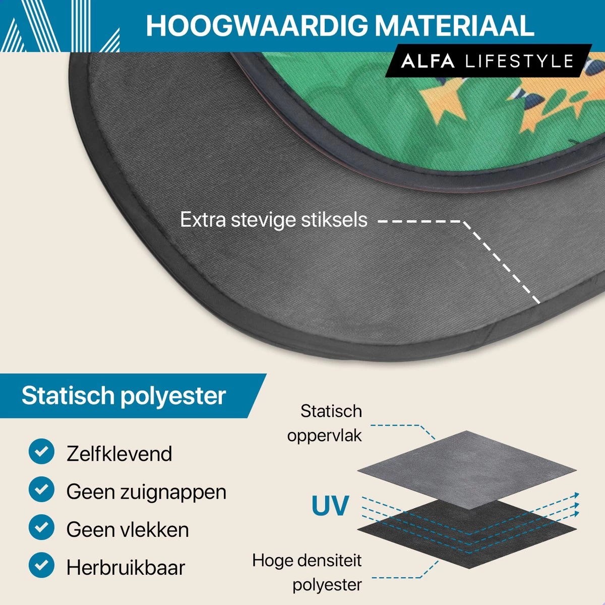 Onze safari zonneschermen zijn voorzien van een vrolijk jungle design; perfect voor de kleintjes. De zonneschermen creëren speelse schaduwen achterin en bescherm de auto tegelijk tegen Uv-straling. Win-win!