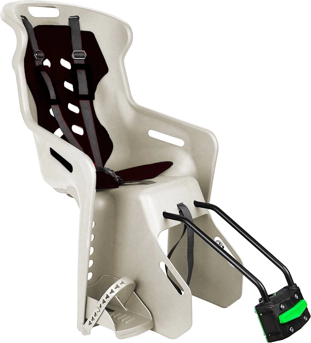 Dit ergonomische stoeltje beschikt over een wasbaar zitje en gordels. Daarnaast zijn de ergonomisch gevormde voetsteunen verstelbaar op verschillende hoogtes. De stevige voetriemen zijn aan te passen op de groei van het kind en het type schoenen. De fietsstoel is compatibel met een groot aantal framevarianten.