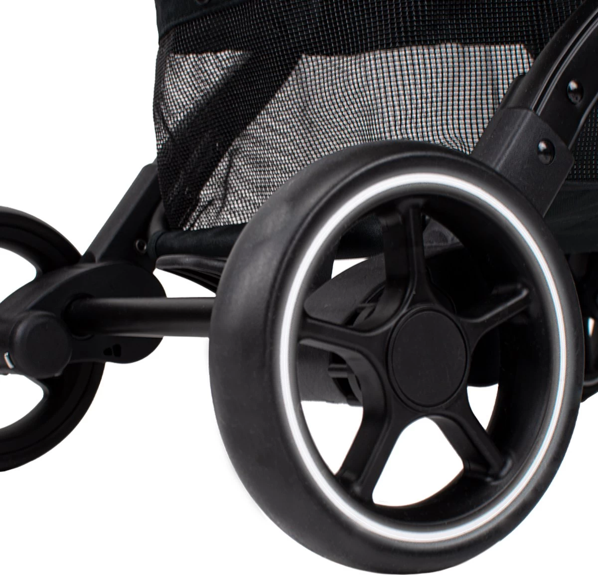 Buggy Sky is zeer wendbaar en rijdt soepel over alle ondergronden. De wielen zijn voorzien van goede vering, en reflectieve strepen zodat je ook in het donker zichtbaar bent. Sky klapt binnen 3 seconden in en uit, en ingeklapt kan de buggy op zichzelf blijven staan. Bovenin de zonnekap zit een doorkijkvenster zodat je altijd je kindje in de gaten kunt houden. Onderin de buggy zit een boodschappenmand, en daarnaast is buggy Sky uitgerust met een vakje in de rugleuning waar je spullen als je telefoon en sleutels in kunt opbergen. Aan de zijkant van het frame zit een cupholder voor flesjes of bekers. Daarnaast wordt de buggy geleverd inclusief regenhoes.