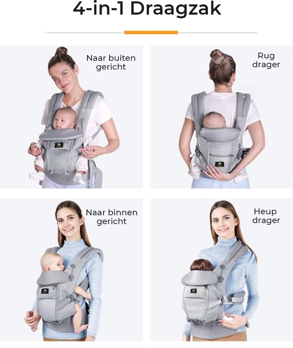 Converteerbare draagzak: draagzak heeft 4 verschillende draagmethoden: 2x voorwaarts dragen (naar binnen en naar buiten gericht); 1x heupdrager; 1x rugdragen;