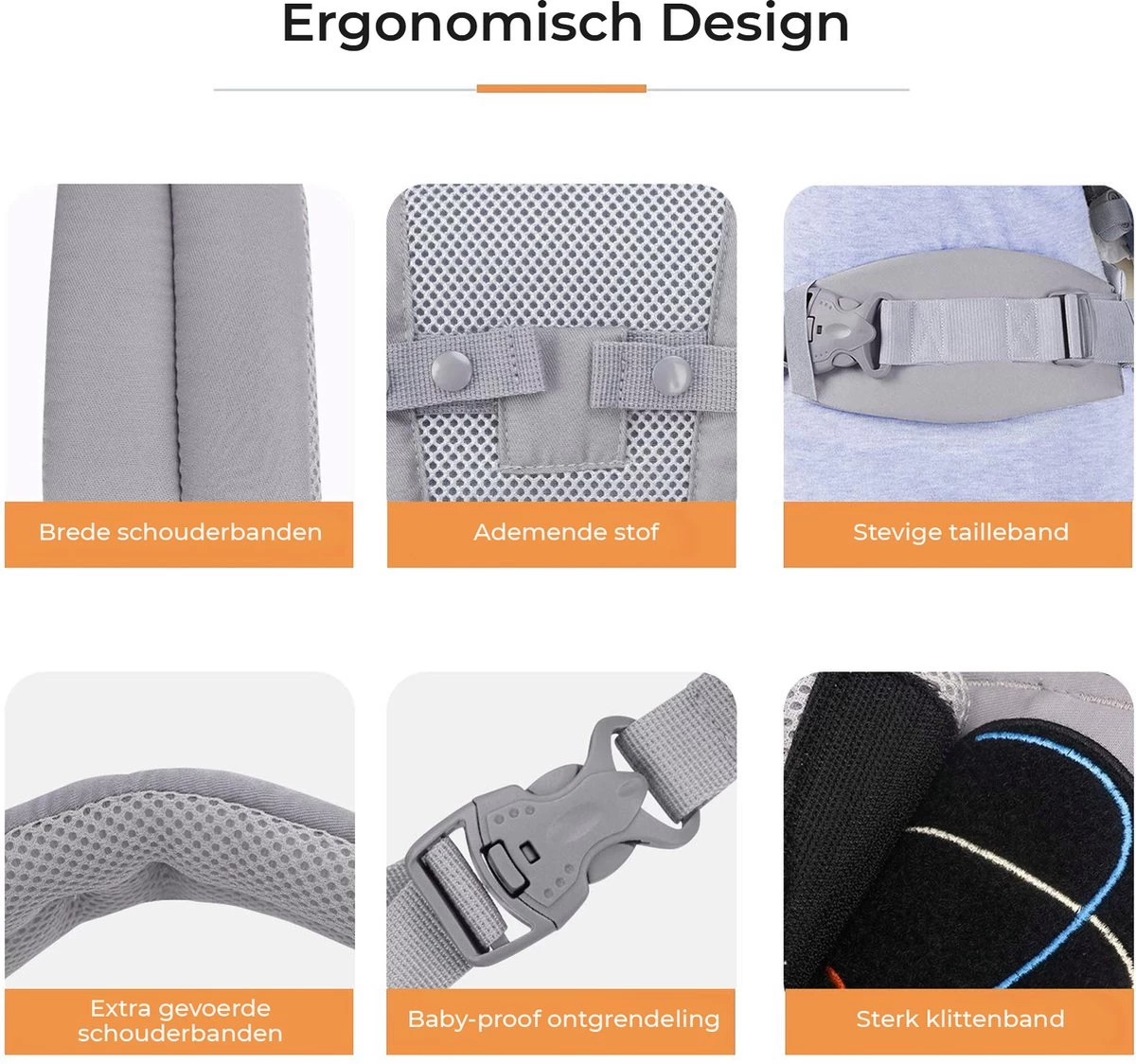Comfortabele babydrager: ademend luchtgaas, verbrede en gevoerde schouderbanden, verbrede en verstelbare heupgordel;