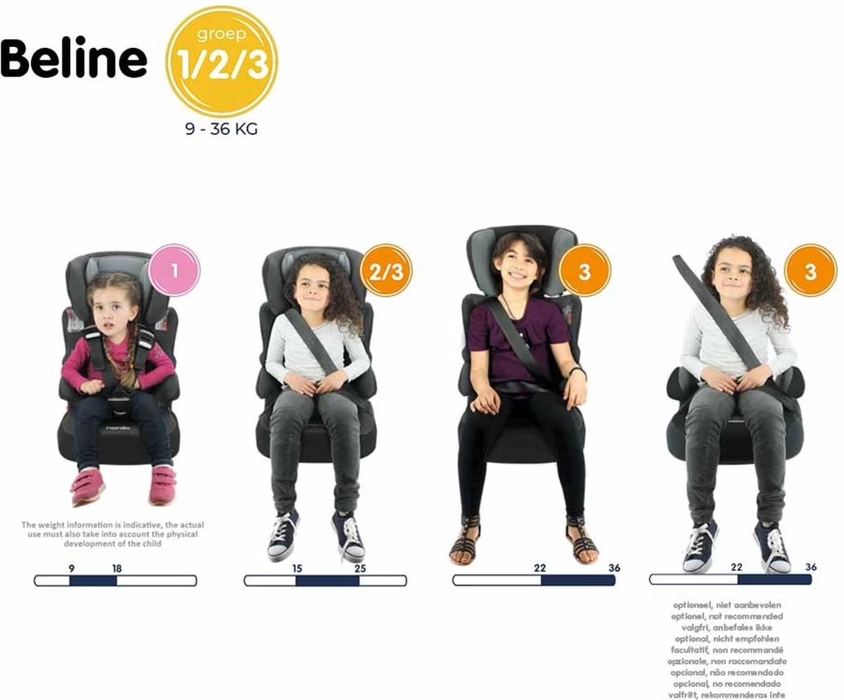 Vanaf 9 KG tot 18 KG zet je je kindje vast met behulp van het interne 5-punts tuigje. Vanaf ongeveer 3 jaar kan je het interne 5-punts tuigje verwijderen en kan het autostoeltje gebruikt worden als junior stoel. Dit kan al vanaf 15 KG tot ongeveer 36 KG (ongeveer 11/12 jaar). Het kindje wordt dan vast gezet met behulp van de in de auto aanwezige 3-punts autogordel.