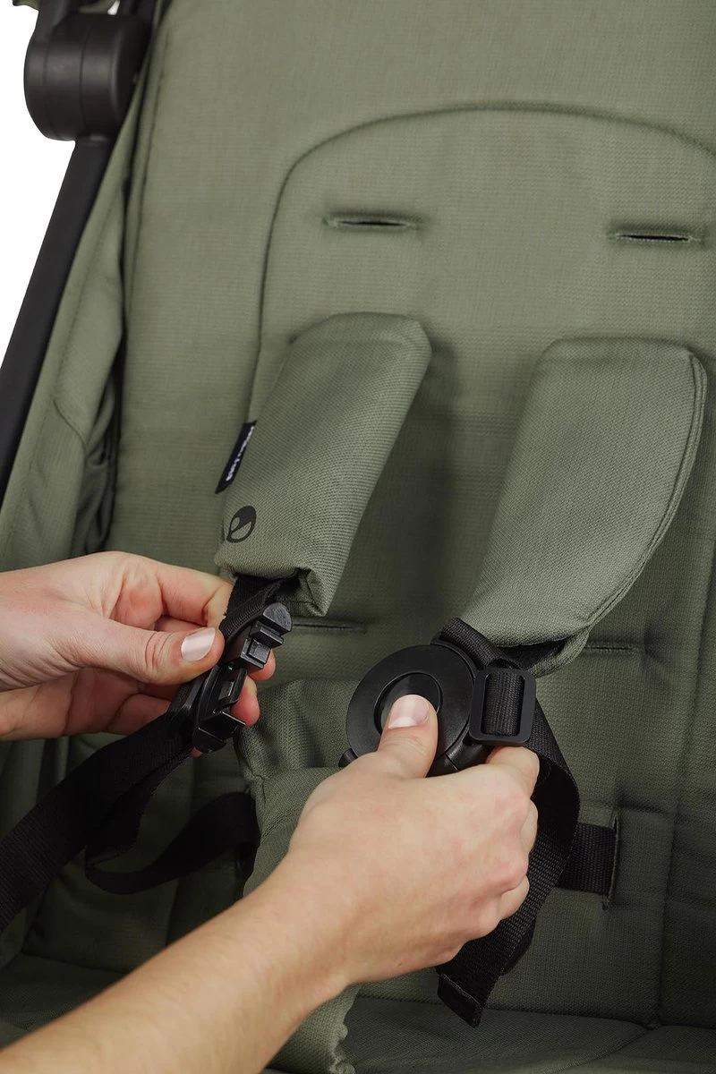 -Alle stoffen zijn waterafstotend en hebben beschermingsfactor UPF 50+. De stoffen van de stoel, kap, riemen, en winkelmand zijn geschikt voor wasmachine: 30 graden.