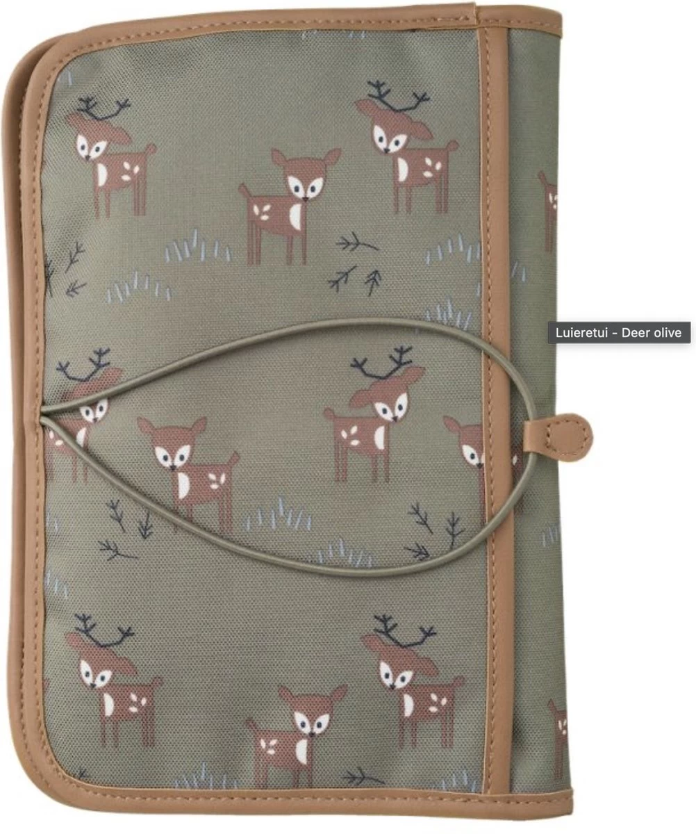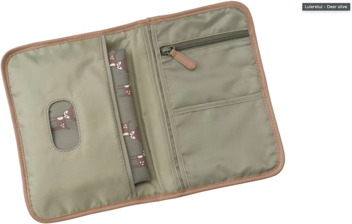 Luieretui Deer Olive van Fresk heeft een handig waterafstotend verschoningsmatje voor onderweg en heeft handig opbergvakjes voor babydoekjes en andere kleine spulletjes. Het luiertasje kan je met een elastische bandje vastmaken.