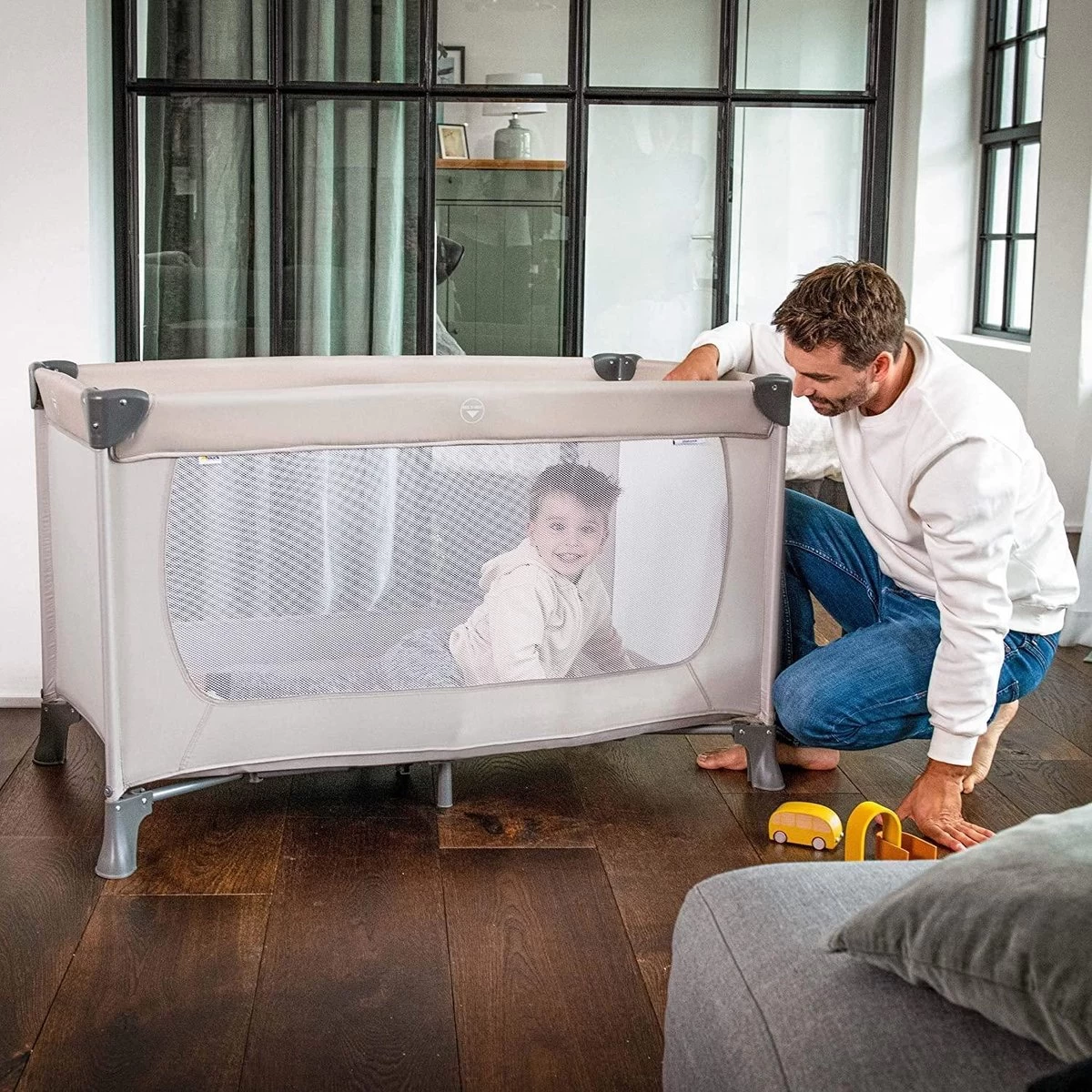Veilig en handig: Zacht gaas aan de zijkant zorgt voor veiligheid en genoeg beluchting in het bed. Het campingbedje heeft 6 poten voor optimale stabiliteit
