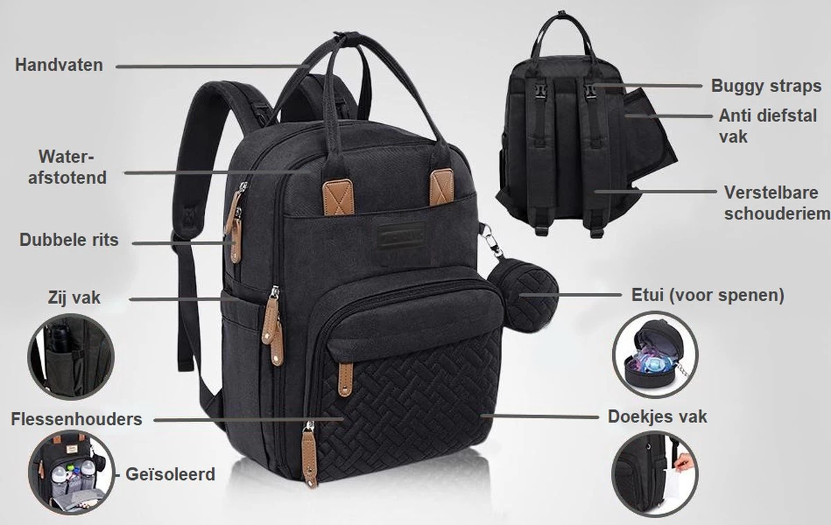 De tas beschikt over een zeer stijlvolle, strakke en moderne uitstraling. Dit maakt de tas geschikt voor werkelijk iedere gelegenheid, en ja ook ieder outfit! Naast dat de luiertas lekker veel opslagruimte biedt kun je deze ook nog eens op verschillende manieren dragen. Naast een schoudertas met verstelbare schouderriemen, heeft de tas ook handige handvaten. Hiermee is de tas snel op te pakken en kan deze zelfs dienen als tote-bag. Dit is nog niet alles! Want je kunt de tas dankzij de twee bijgeleverde buggy straps binnen een handomdraai ophangen aan je buggy, wandelwagen of kinderwagen. Zo kies je telkens zelf hoe je de tas het liefste draagt. Daarbovenop is er een extra riem aan de achterkant waarbij je de rugzak gemakkelijk over je kofferhandgreep kan plaatsen!
