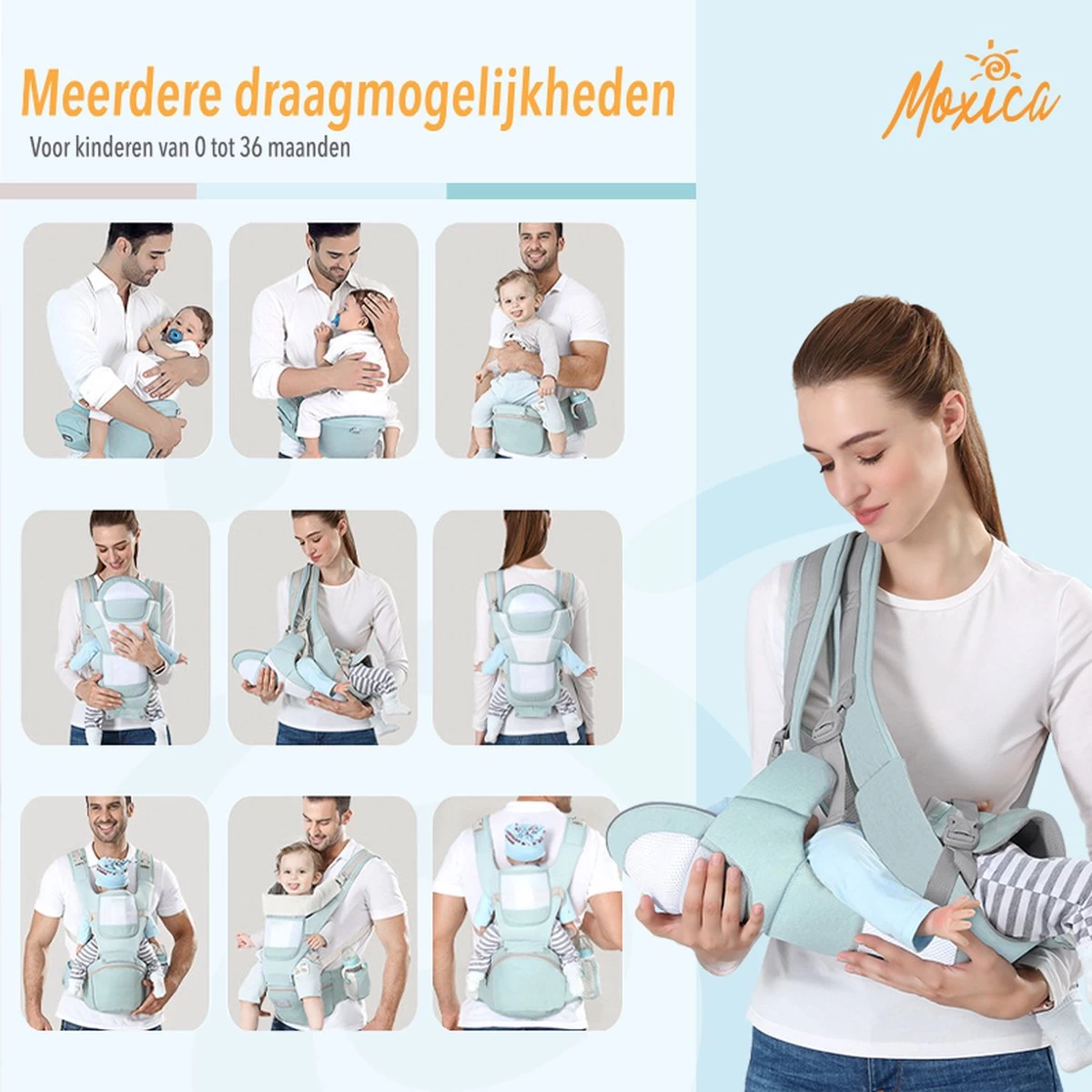 Door de zes draagmanieren heb je altijd een draagwijze die past bij de groeifase van je baby. Met de tailleband van klittenband en de verstelbare gespen stel je de draagzak gemakkelijk af. De verstevigde heupkruk en schouderbanden verdelen het gewicht van je kindje goed over je lichaam. Door de kleine helling in de heupkruk zit je kindje altijd dicht tegen je aan, dit verminderd stoten en schudden tijdens het lopen en geeft een veilig en comfortabel gevoel.
